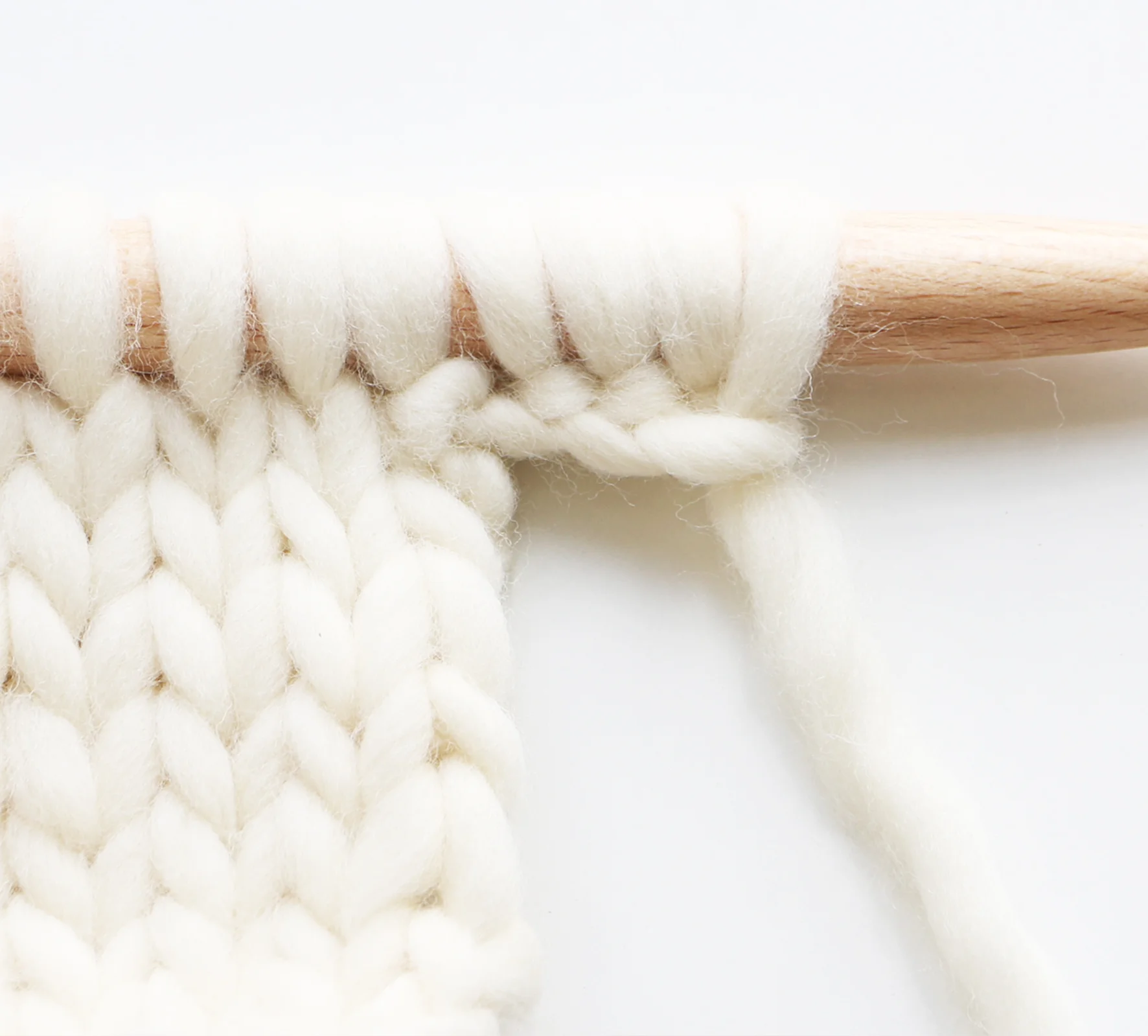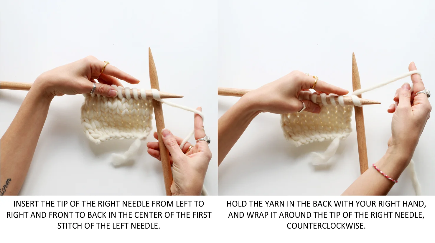 • Hold the yarn in the back with your right hand, and wrap it around the tip of the right needle, counterclockwise.